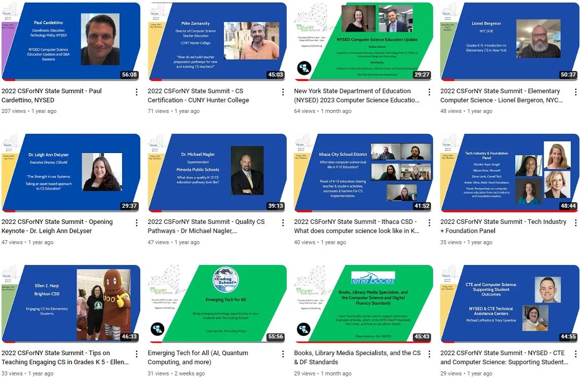 Visit the CSForNY YouTube to view all Summit videos, including sessions from NYSED, CSTA, NYSCATE, CSForAll, district and school leaders, and CS teachers. You'll learn about NY's standards, certification, CTE regulations, and more!